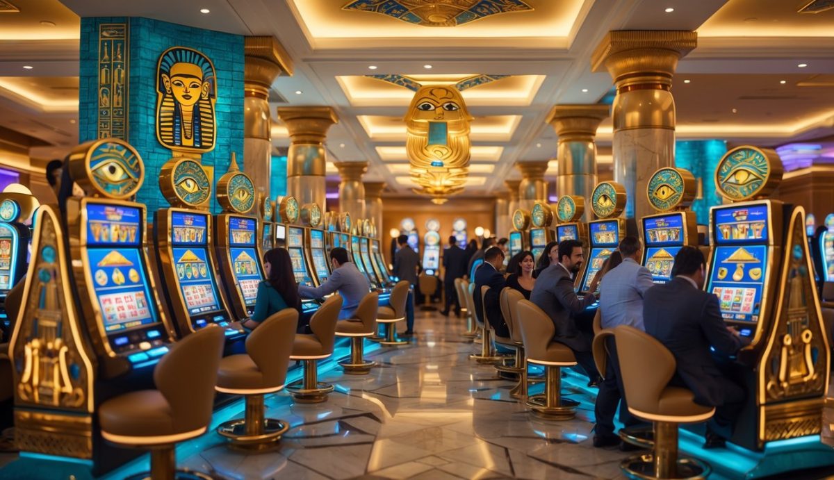 Area mesin slot bertema Mesir kuno dengan dekorasi emas dan turkis, orang-orang bermain mesin slot di lingkungan kasino yang mewah.