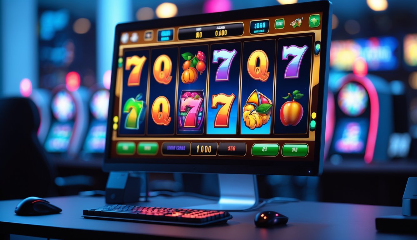 Sebuah meja dengan komputer menampilkan permainan slot online dengan gulungan berwarna-warni yang sedang berputar.